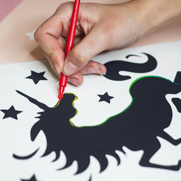 Приятным бонусом в наборе будет радужное покрытие внизу и 2 трафарета для ещё более занимательного творчества! Использовать их очень просто. Приложите трафарет к основе и заполните теми персонажами, которые вам понравятся. Будет невероятно интересно придумывать оригинальные узоры! Созданный своими руками шедевр искусства можно подарить самым близким людям.