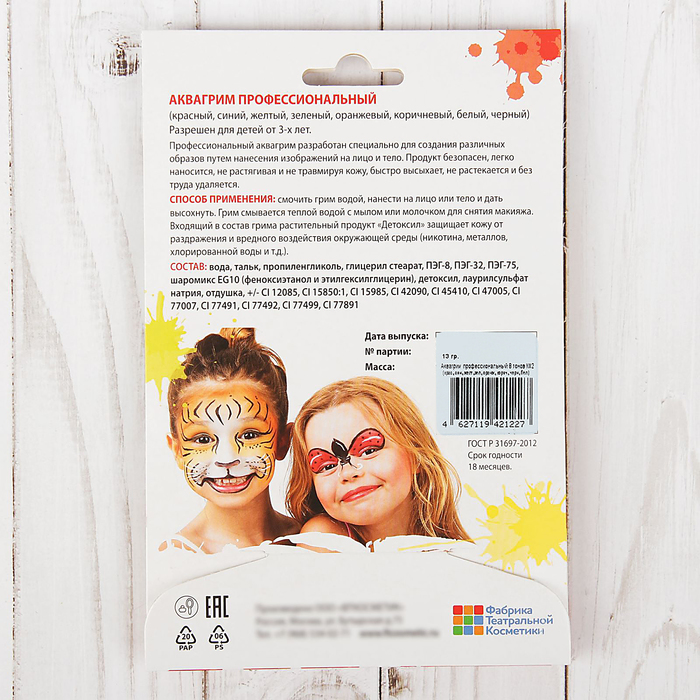 Может быть, именно такой необычный товар, как Аква-грим профессиональный, 8 тонов, 30 г, раскроет неожиданные способности у вашего ребёнка. И даже если он не станет новым Рафаэлем, то ему, определённо, обеспечена богатая фантазия, креативное мышление и золотые руки.