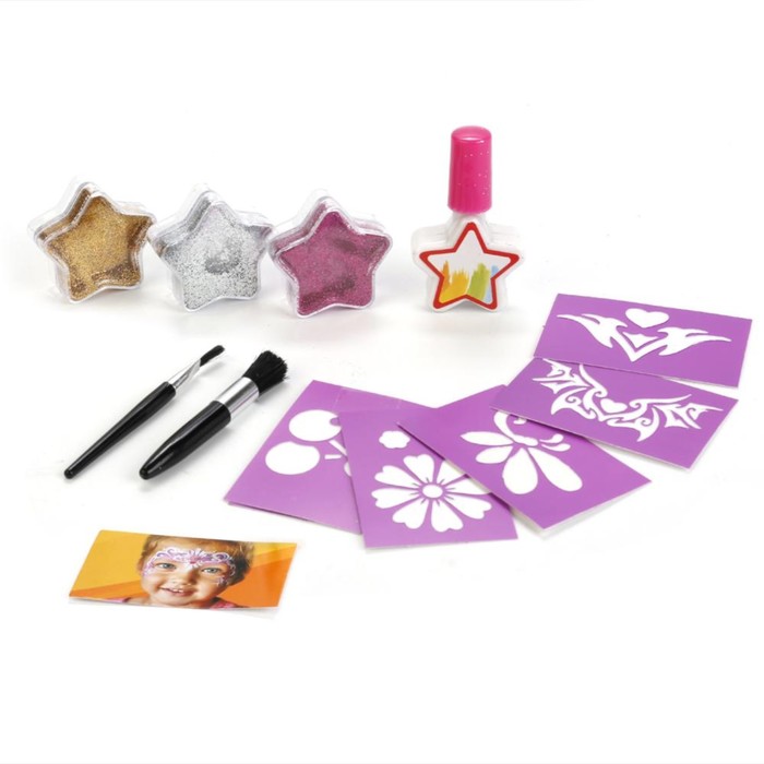 Аквагрим & Тату MultiArt: блестки 3 цвета, 2 кисточки, 2 трафарета для тату 36104-GL