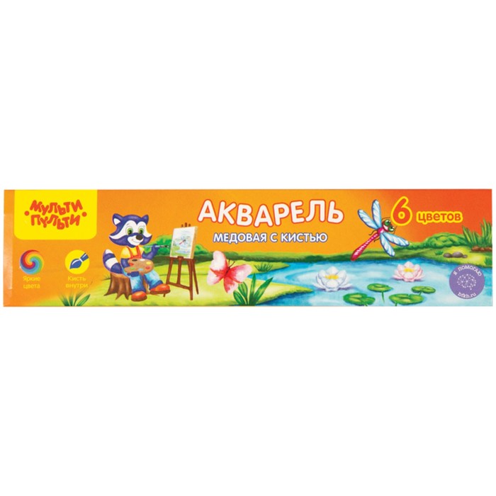 Акварель Мульти-Пульти «Приключения Енота», 6 цветов, медовая, с кистью