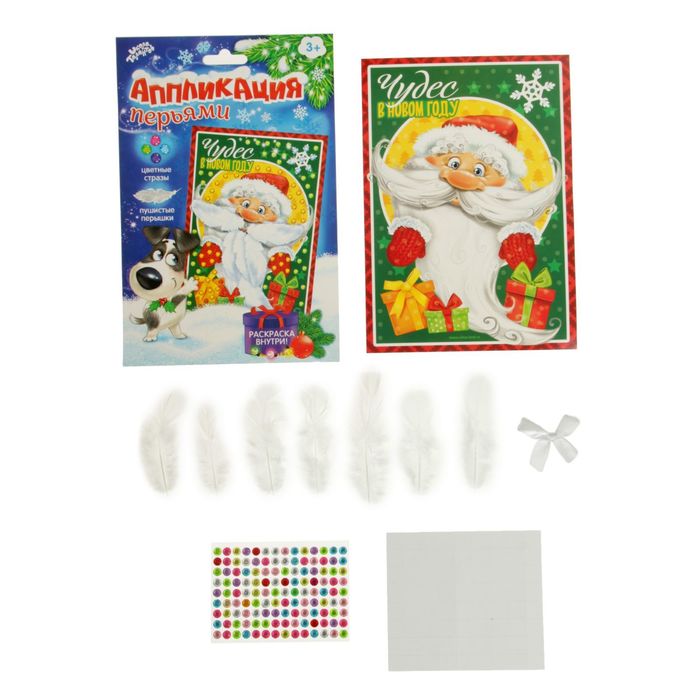 Аппликация перьями и стразами "Дед Мороз" + бантик