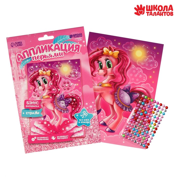 Аппликация перьями и стразами "Пони"+ бантик развивает мелкую моторику и координацию движений, креативное зрительное восприятие, усидчивость, аккуратность, внимательность и формирует художественный вкус.