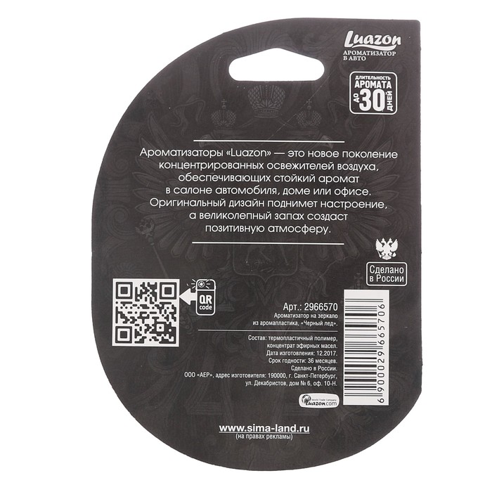Не секрет, что машина давно уже перестала восприниматься как просто средство передвижения, и водители покупают всё лучшее для своих железных коней. Ароматизатор на зеркало из аромапластика "Черный лёд", серия герб — идеальный выбор, если вы ставите целью и улучшение технических характеристик, и поддержание внешнего вида автомобиля.