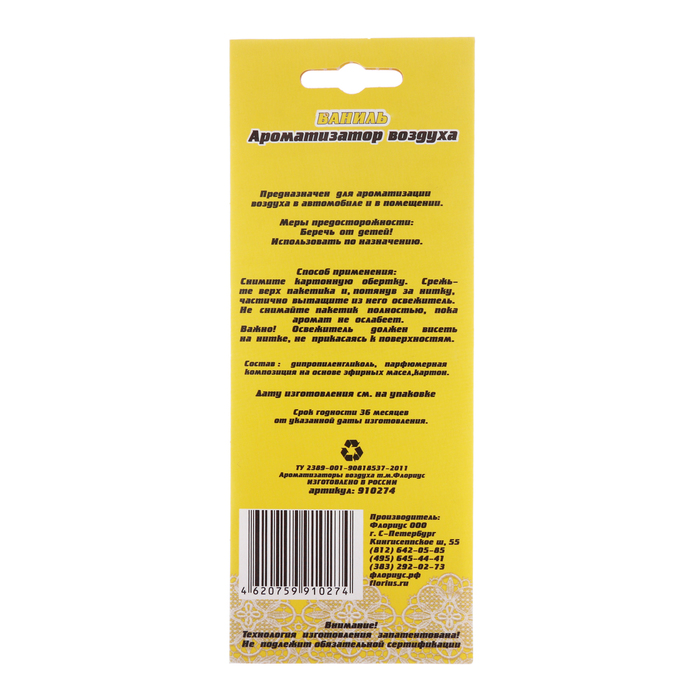 | Вид ароматизатора | Бумажный |