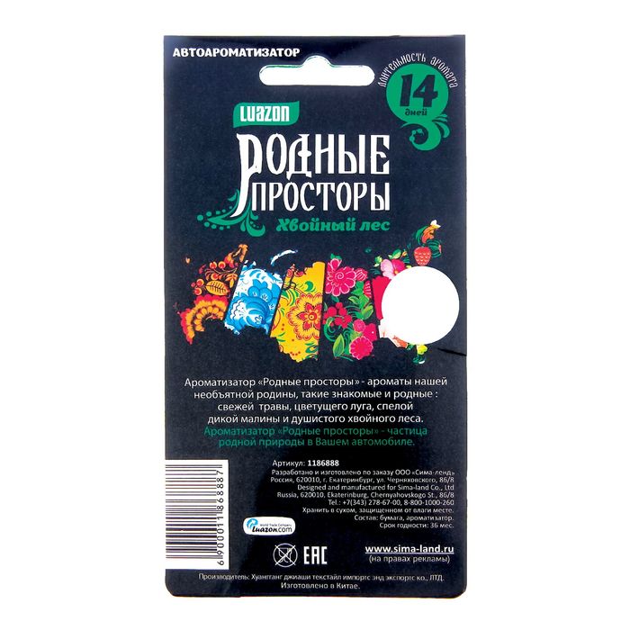 Яркости в серые городские будни и скучную езду по пробкам добавит ароматизатор в авто серия Родные узоры хвойный лес. В нём сочетаются эффектный дизайн в русском стиле и приятный аромат родных просторов. Да пребудет с вами русский дух.