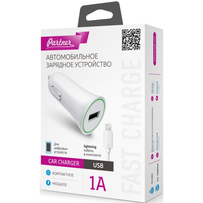 Авто З/У Partner (033501) USB 1000 mA + кабель Apple 8-pin белый