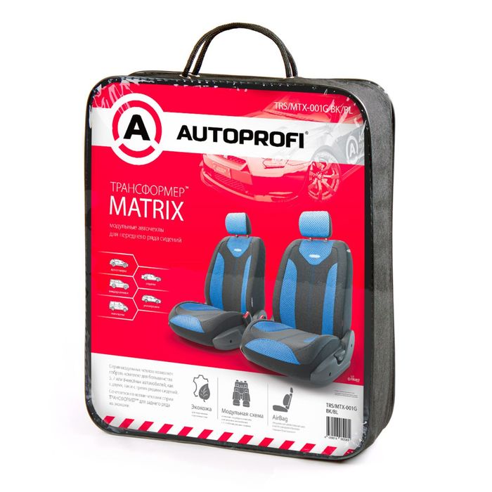 Авточехлы универcальные AUTOPROFI Трансформеры MATRIX, TRS/MTX-001G BK/BL, экокожа, набор из 6 предметов, передний ряд, цвет чёрный/синий