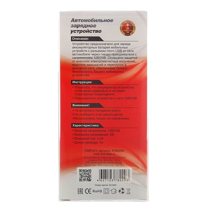 Заряжайте аккумуляторные батареи ваших мобильных устройств через разъём micro USB с помощью AVS CMR-211. Он работает от сети автомобиля через гнездо прикуривателя с напряжением 12 или 24 В. Прибор защищён от короткого замыкания, электромагнитных излучений и перегрузок в выходной сети, что обеспечивает безопасность вашего телефона и гарантирует его полную исправность после подзарядки!