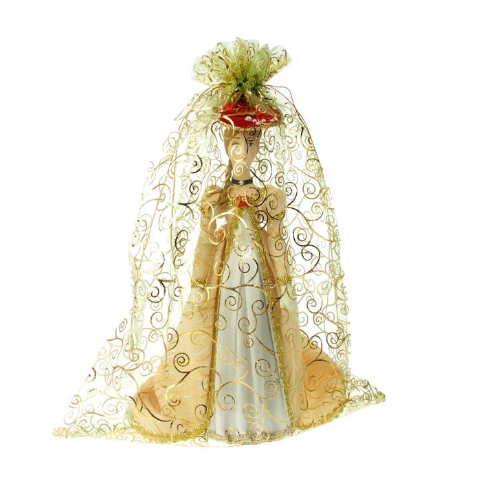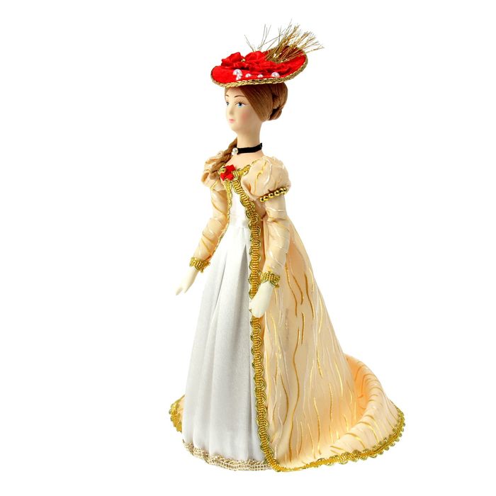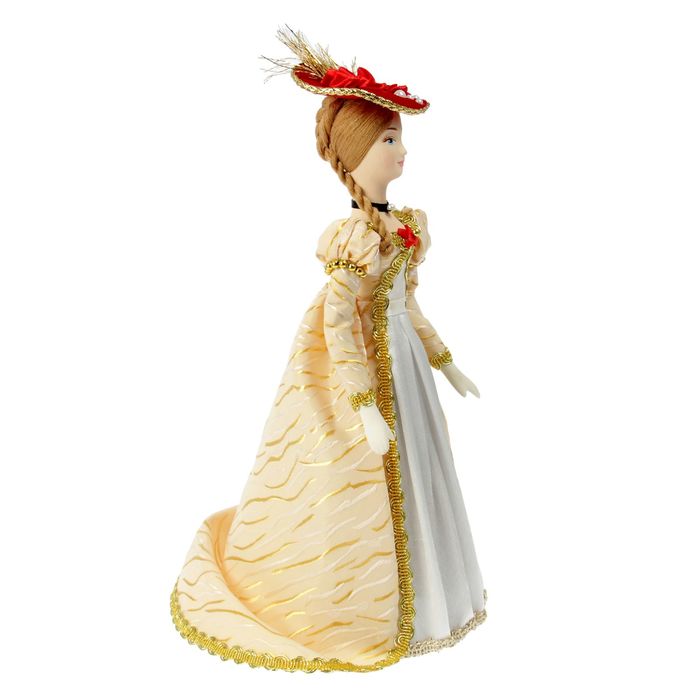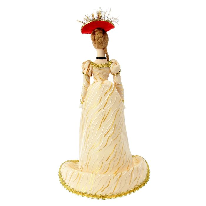 Сувенирная кукла выполнена российскими мастерами вручную, начиная от этапа замешивания фарфора и заканчивая росписью и пошивом наряда. Великолепное одеяние детально проработано, в нём чувствуется рука настоящего мастера, который кропотливо выкроил миниатюрные детали платья, используя несколько видов ткани.