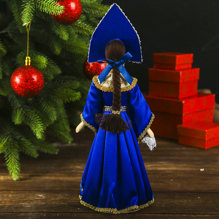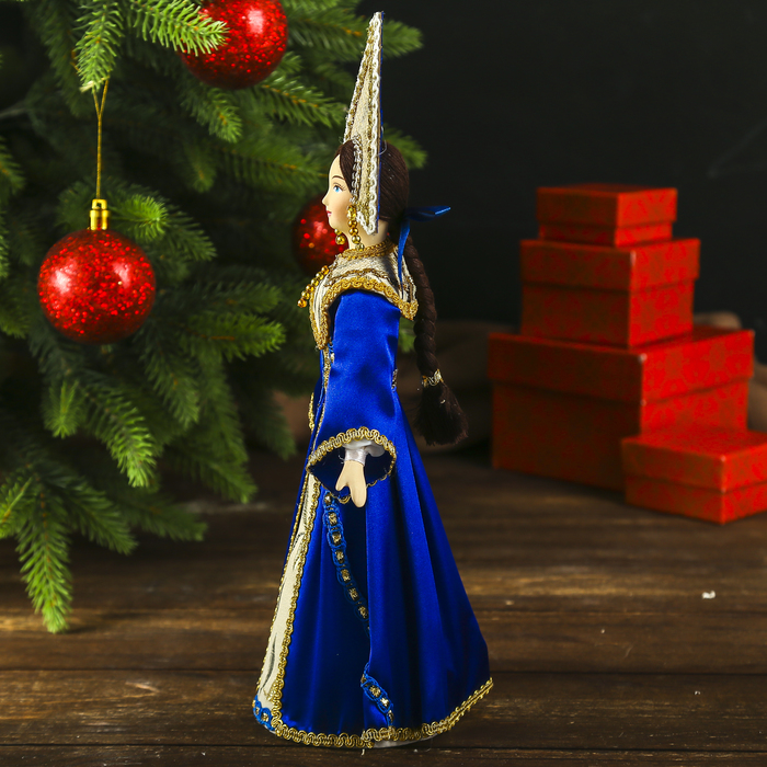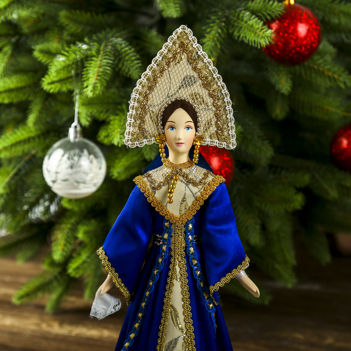Сувенирная кукла выполнена российскими мастерами вручную, начиная от этапа замешивания фарфора и заканчивая росписью и пошивом наряда. Великолепное одеяние детально проработано, в нём чувствуется рука настоящего мастера, который кропотливо выкроил миниатюрные детали платья, используя несколько видов ткани.