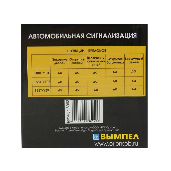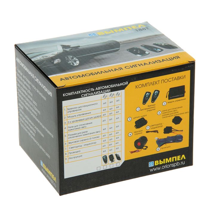 Автосигнализация "Вымпел", 188T-Y39, два датчика удара, сирена, 15 Вт