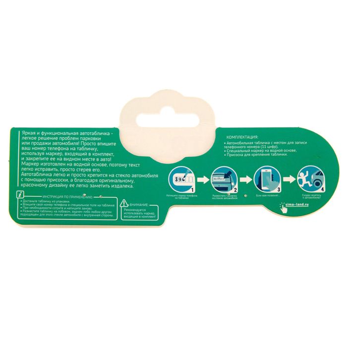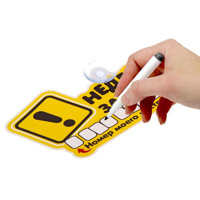 В комплект входит специальная присоска и стирающийся маркер. Первая прочно прикрепит табличку к заднему или переднему стеклу. С помощью второго вы напишите свой номер телефона, а при необходимости сотрёте его и укажете новый.