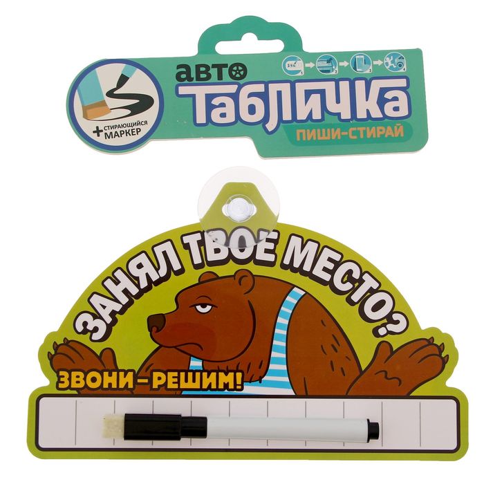 В комплект входит специальная присоска и стирающийся маркер. Первая прочно прикрепит табличку к заднему или переднему стеклу. С помощью второго вы напишите свой номер телефона, а при необходимости сотрёте его и укажете новый.