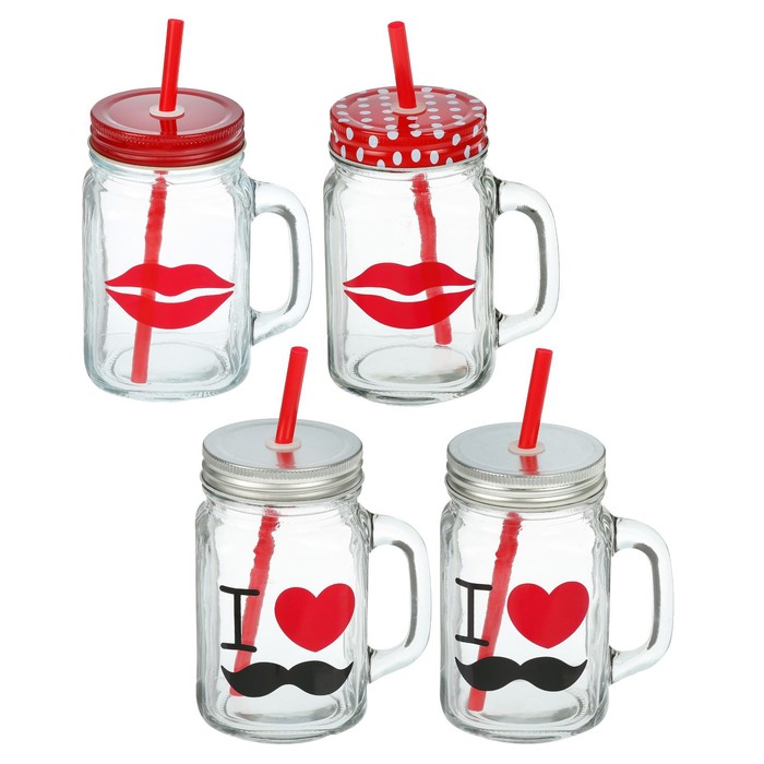 Банка 450 мл "Леди и Джентльмены", с ручкой, крышкой и трубочкой, цвета МИКС
