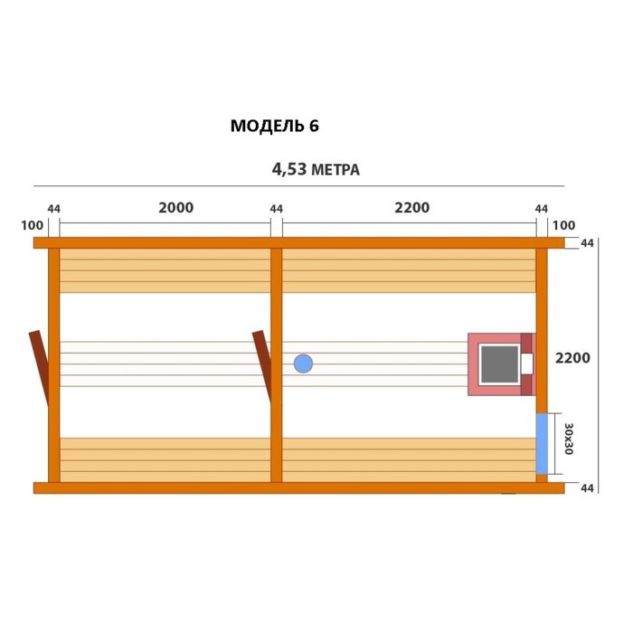 Баня-бочка, 453 х 220 х 220 см, 2 отделения, без печи, 4,53/6