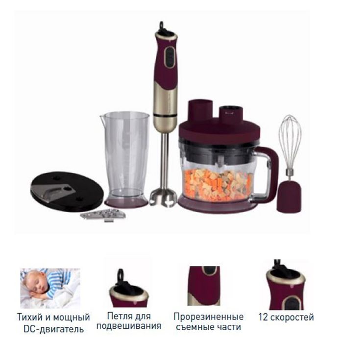 Нож-измельчитель, венчик для взбивания, тёрка, шинковка и насадка-блендер изготовлены из высококлассной нержавеющей стали и легко меняются простым нажатием кнопки. А эргономичная прорезиненная рукоятка со специальным покрытием обеспечивает дополнительное удобство при эксплуатации.