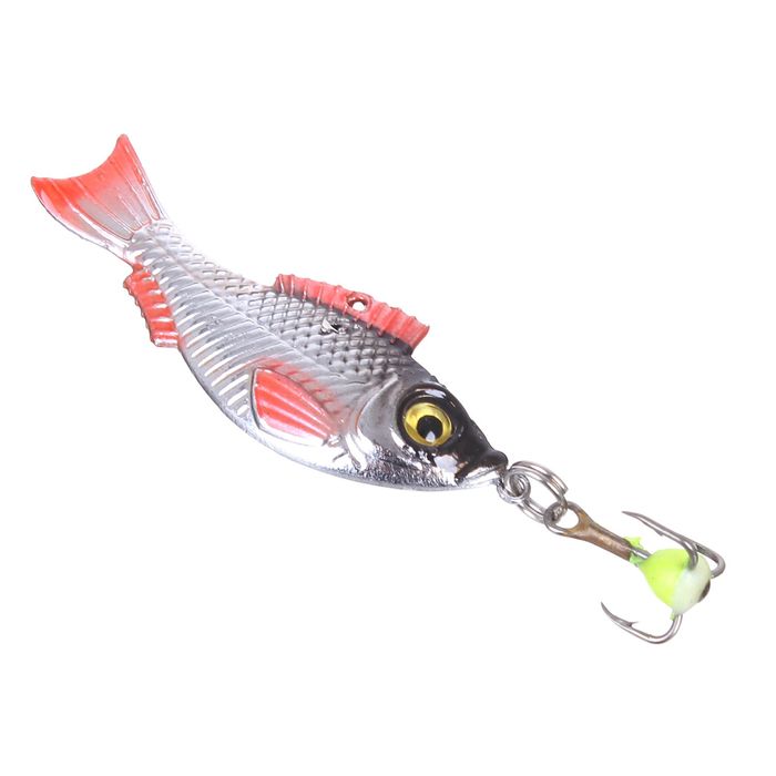 Тройной крючок с фосфорной светящейся капелькой делает блесну более уловистой.