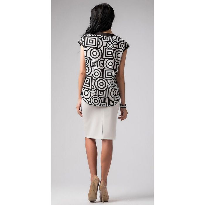 - округлый вырез горловины и короткие цельнокроеные рукава дополнены однотонной отделочной тканью.