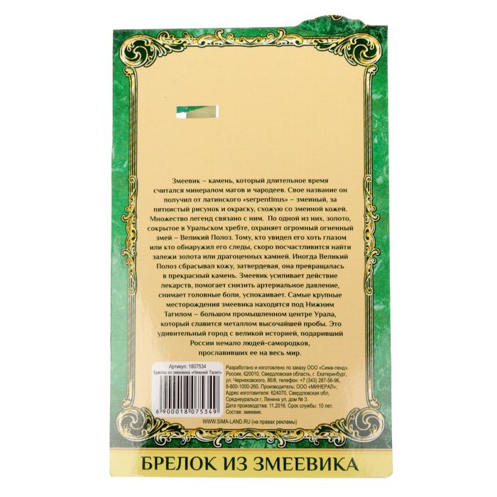 Змеевик усиливает действие лекарств, помогает снизить артериальное давление, снимает головные боли, успокаивает. Крупные месторождения камня находятся под Нижним Тагилом — большим промышленным центром Урала, который славится металлом высочайшей пробы. Это удивительный город с великой историей, подаривший России немало людей-самородков, прославивших её на весь мир.