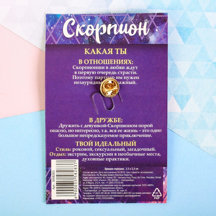 Ни один стиляга не будет выглядеть современно без искусно подобранных украшений, которые завершат его образ! Бижутерия — это современная недорогая альтернатива изделиям из золота и прочих драгоценных металлов. Брошь металлическая гороскоп "Скорпион" — это то, что добавит вам шарма!