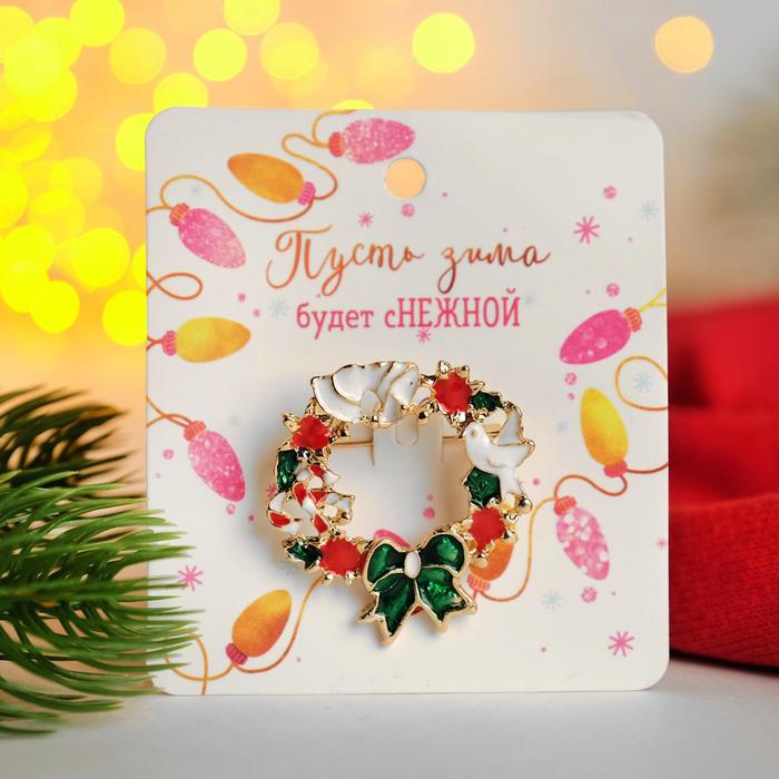 Ни один стиляга не будет выглядеть современно без искусно подобранных украшений, которые завершат его образ! Бижутерия — это современная недорогая альтернатива изделиям из золота и прочих драгоценных металлов. Брошь "Новогодняя сказка" венок с голубями, цвет красно-бело-зеленый в золоте — это то, что добавит вам шарма!