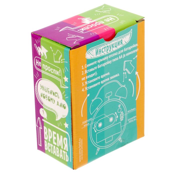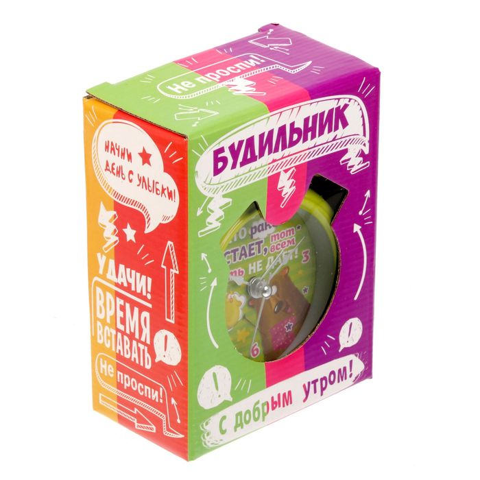 Вставать по утрам — непростая задача. Так приятно понежится в тёплой кроватке лишние 5 минуточек… но коварные стрелки неумолимо движутся вперёд, и существует опасность проспать все важные дела! Будильник спасёт вас от ненужного риска. Его заливистый звон точно не даст вам уснуть. Стильный красочный дизайн и оригинальные надписи будут радовать владельца долгие годы, а крепкий металлический корпус выдержит все удары судьбы.
