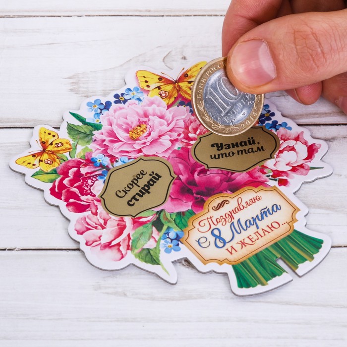 Букет со скретч-слоем "Поздравляю" — сувенир в полном смысле этого слова. И главная его задача — хранить воспоминание о месте, где вы побывали, или о том человеке, который подарил данный предмет. Преподнесите эту вещь своему другу, и она станет достойным украшением его дома.