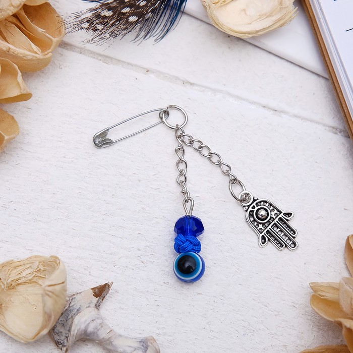 Ни один стиляга не будет выглядеть современно без искусно подобранных украшений, которые завершат его образ! Бижутерия — это современная недорогая альтернатива изделиям из золота и прочих драгоценных металлов. Булавка-оберег 2 подвески "Рука счастья с бусинами", 2 см, цвет синий в серебре — это то, что добавит вам шарма!
