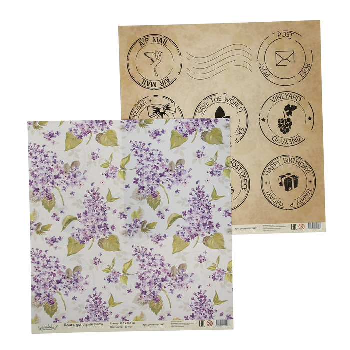 Бумага для скрапбукинга "Семейные ценности. Сирень и штампы" 30,5х30,5 см 190г/м2