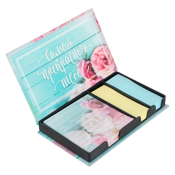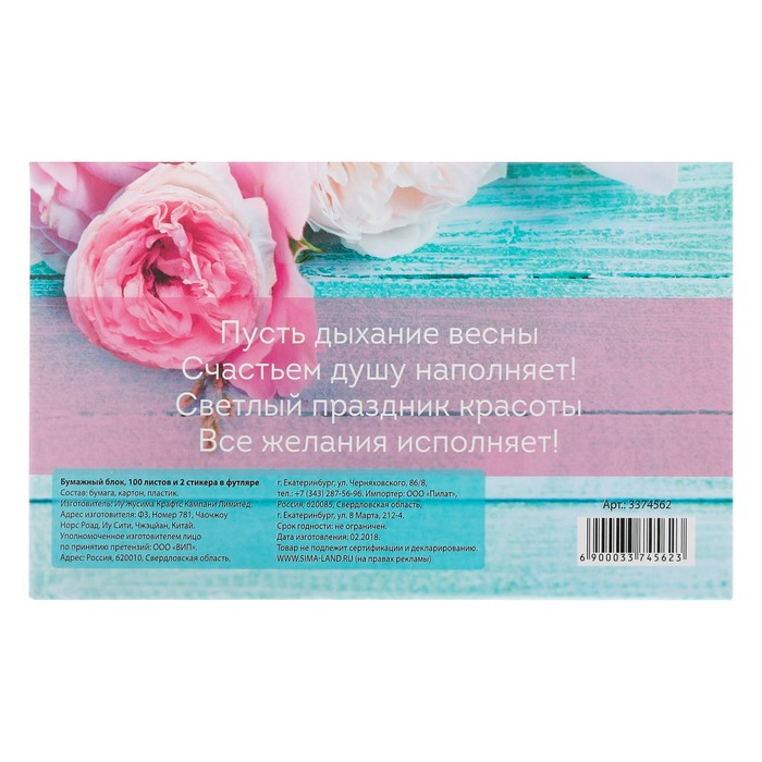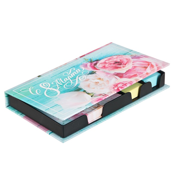Бумажный блок в пластиковом футляре "С 8 марта": 100 листов и 2 набора стикеров