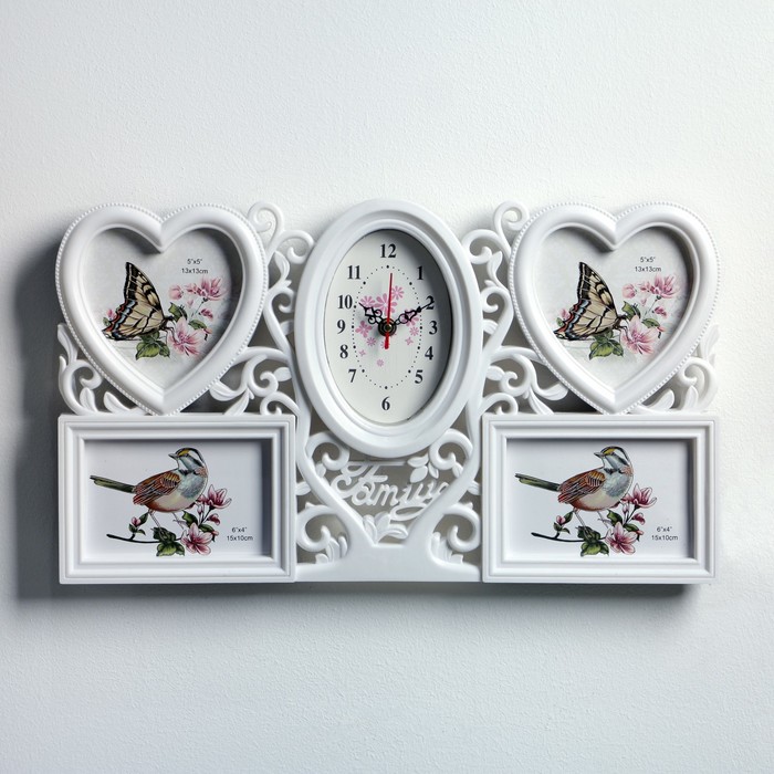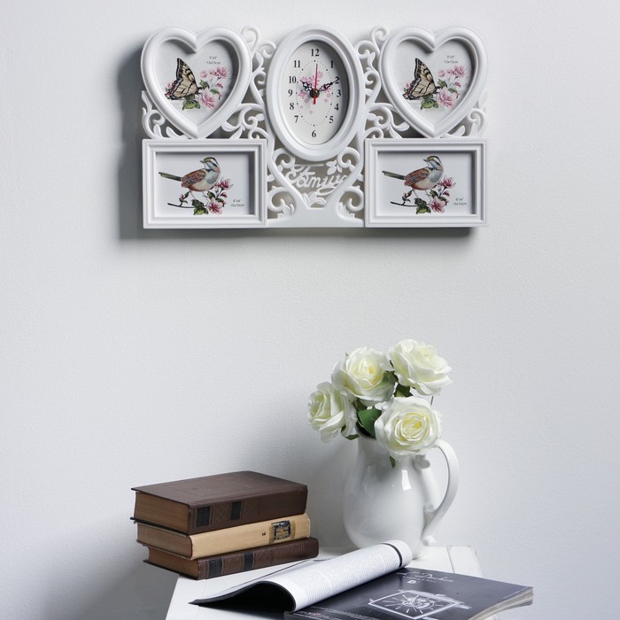 Каждому хозяину периодически приходит мысль обновить свою квартиру, сделать ремонт, перестановку или кардинально поменять внешний вид каждой комнаты. Часы настенные хайтек+4 фоторамки Family сердечки белые (фото 13*13, 15*10см) 50*30*5см микс — привлекательная деталь, которая поможет воплотить вашу интерьерную идею, создать неповторимую атмосферу в вашем доме. Окружите себя приятными мелочами, пусть они радуют глаз и дарят гармонию.
