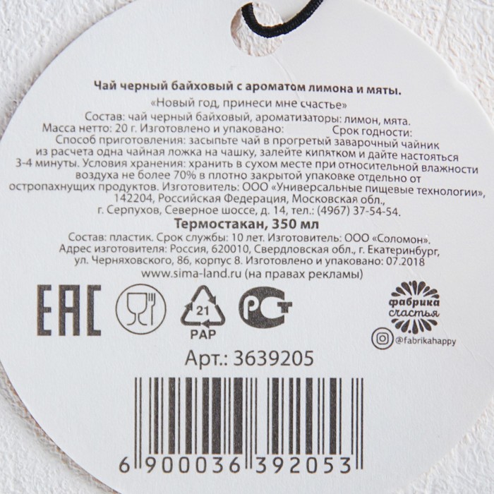 Чай лимон и мята 20 гр. в термостакане "Новый год принеси мне счастье" СГ