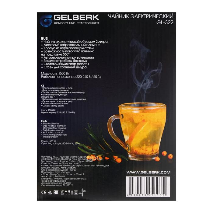 Чайник электрический GELBERK GL-322, 1500 Вт, 2 л, желтый — полезный бытовой прибор на любой кухне. Данная модель изготовлена из термостойких материалов, которые надолго сохраняют первозданный внешний вид. Особая конструкция гарантирует твёрдое положение прибора на различных поверхностях. Оптимальные объём и мощность обеспечивают быстрое закипание воды.