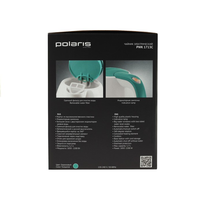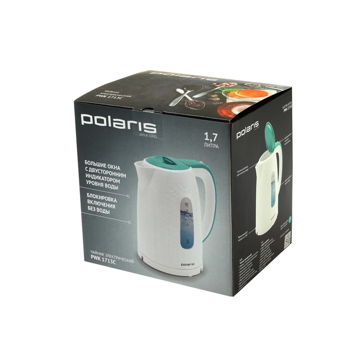 Чайник электрический Polaris PWK 1713C, 2200 Вт, 1.7 л, бирюзовый