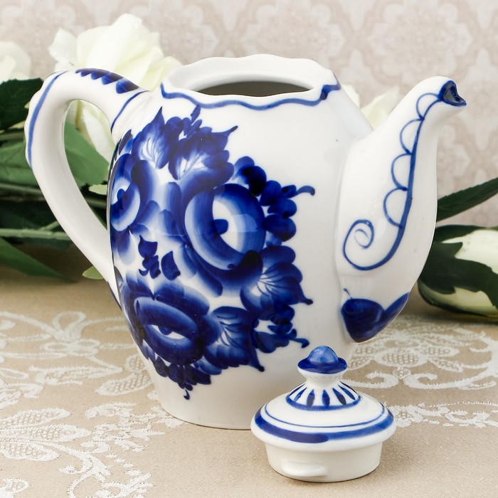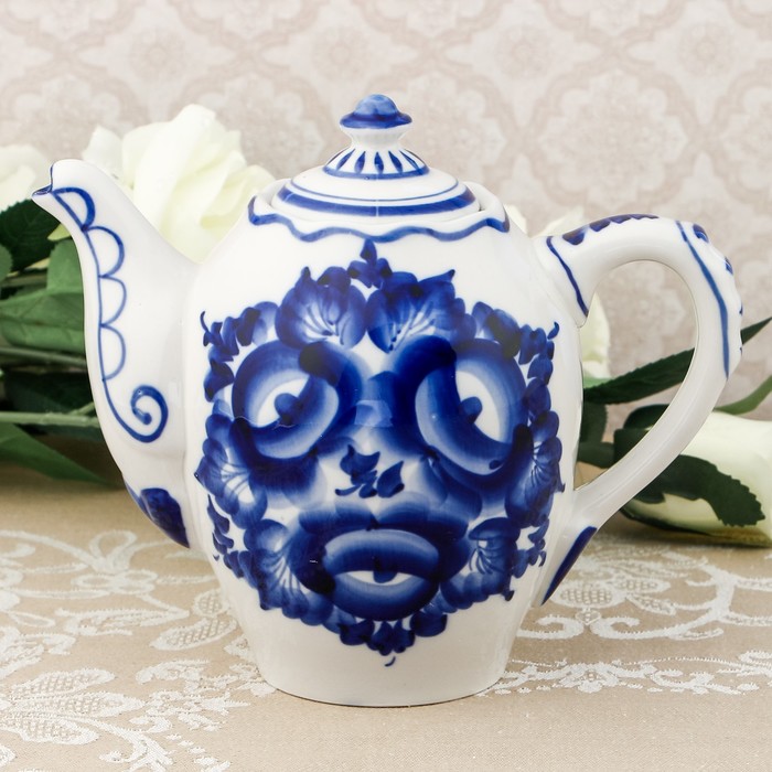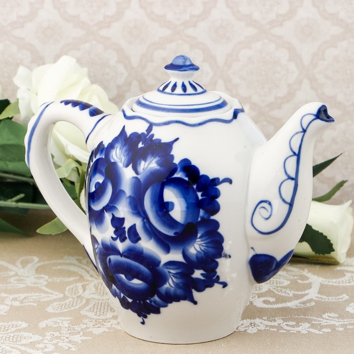 Гжель словно вобрала в себя красоту русской зимы: белизну снега, твёрдость льда, сияние инея, вычурность морозных узоров, синеву неба в ясные дни.