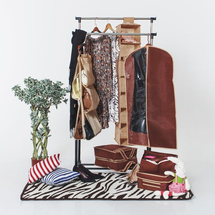 - Опрятный внешний вид. Больше никаких платьев, кофт и юбок, висящих вразнобой. Аккуратные чехлы позволяют рассортировать одежду и скрыть её от посторонних глаз. Для людей, использующих стойки вместо обычного шкафа— это самый оптимальный вариант.