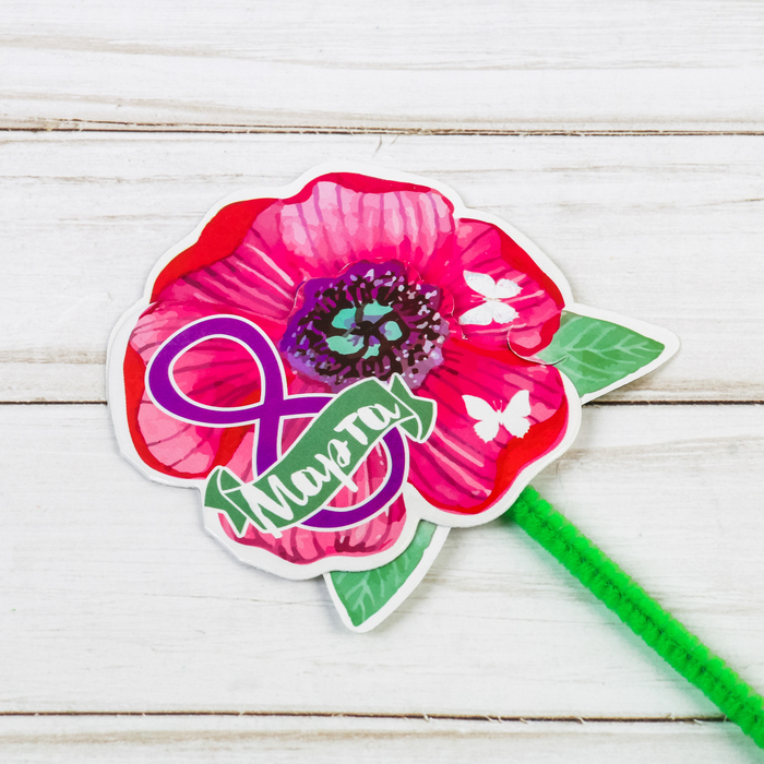 Выразить свои чувства и дополнить основной подарок тёплыми словами вам поможет Цветок на ножке "С 8 Марта". С ней ваше пожелание «Счастья, любви и здоровья» приобретёт трепетный и душевный подтекст. А воспоминания о праздничном дне ещё долго будут радовать адресата.