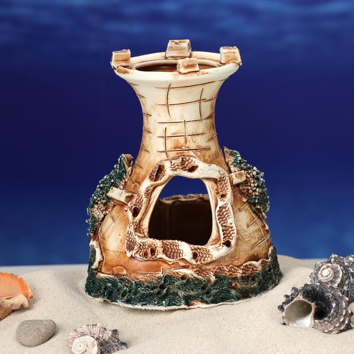 Декорация устойчива к воздействию температуры и подходит для пресной и морской воды. В изделии есть множество отверстий, в которых смогут укрываться мелкие рыбки.