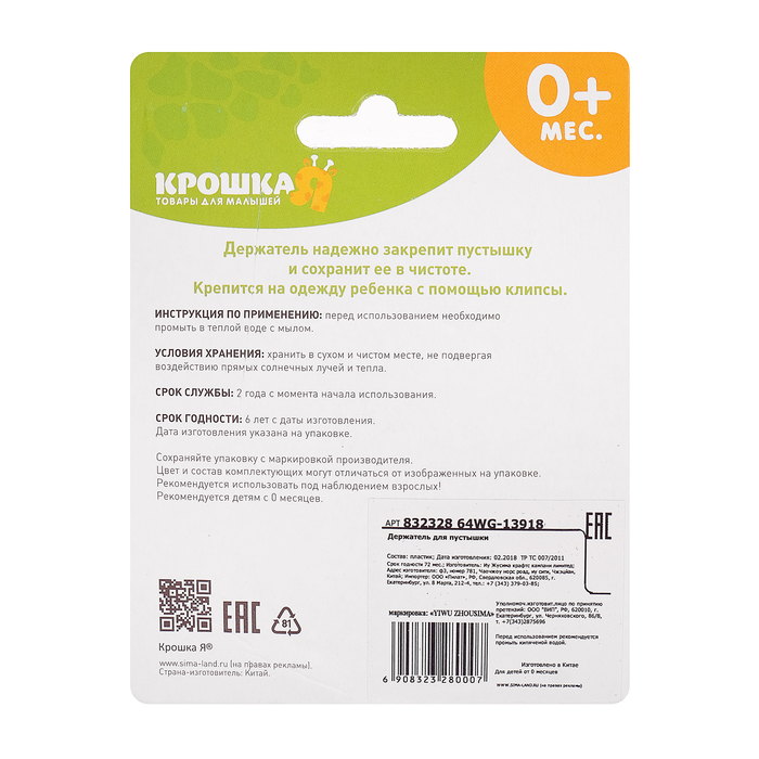 Изделие фиксируется на одежде ребёнка. На конце цепочки есть карабин, который зацепляется за кольцо пустышки. Надёжное крепление убережёт вещь от падения на пол, если малютка случайно выронит её изо рта.