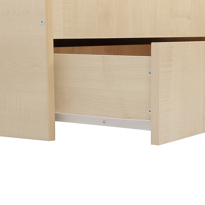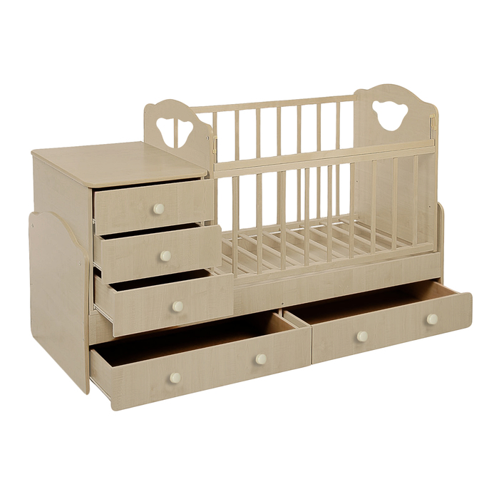 Данная кроватка — это модель для тех, кто ценит практичность. Родители выбирают её за многофункциональность, эргономичность и стильный дизайн с фигурными спинками. Модуль классической кроватки для новорождённых можно использовать с рождения крохи и до достижения им 4-х лет. У неё безопасные закруглённые углы и обтекаемая форма. Комод можно установить как справа, так и слева от кроватки. Столешницу можно использовать в качестве пеленального столика. Детское постельное бельё удобно хранить во вместительном выдвигающемся ящике, который обеспечит чистоту и порядок. В тумбочке можно разместить пижаму и другую одежду вашего чада. Когда малыш подрастёт, трансформируйте изделие в большую кровать без бортиков, сняв тумбу со шкафчиками. На ней ребёнок будет спать до подросткового возраста.