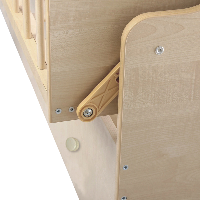 Кроватка-трансформер изготовлена из натуральной древесины и ЛДСП. Изделие соответствует современным стандартам качества и безопасности детской продукции.