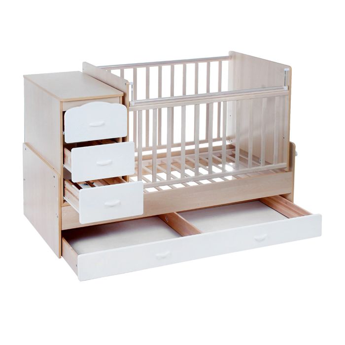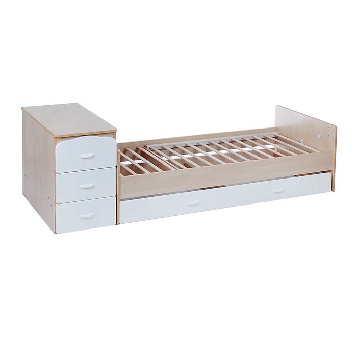 Кровать-трансформер понравится тем, кто ценит практичность. Модель предназначена для детей с рождения до 12 лет. Для младенцев комплект мебели используется как кроватка и пеленальный комод. Когда малыш подрастёт, превратите изделие в большое ложе без бортиков и снимите тумбу.