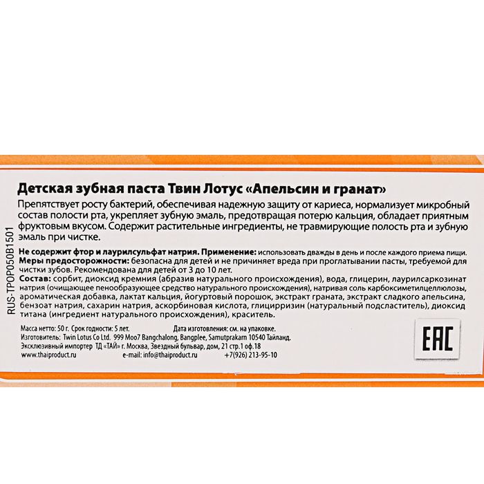 Детская зубная паста "TWIN LOTUS" "Апельсин и Гранат", 50гр