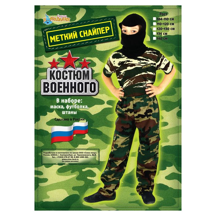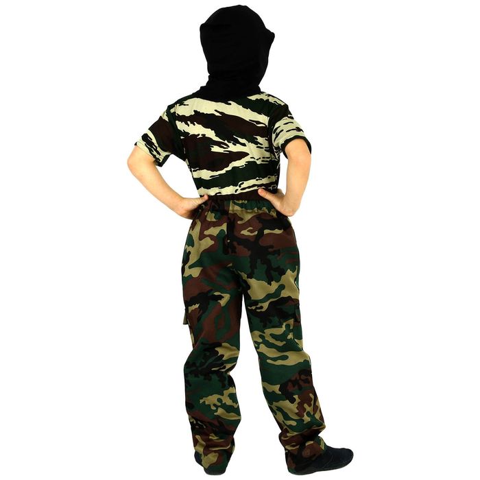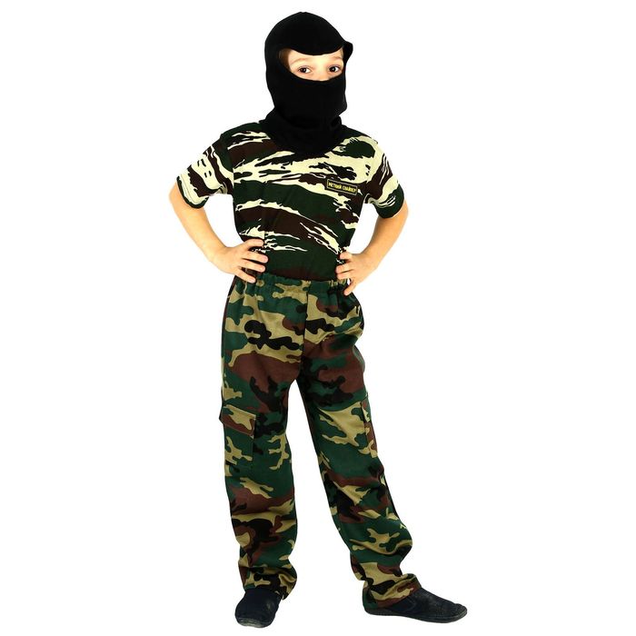 Детский камуфляжный костюм "Меткий снайпер", штаны, футболка, маска, рост 122 см превратит ребёнка в храброго стрелка, всегда попадающего в цель. Такой наряд камуфляжной расцветки отлично подойдёт для любого военного праздника, выступлений на сцене, тематических представлений или вылазки на природу.