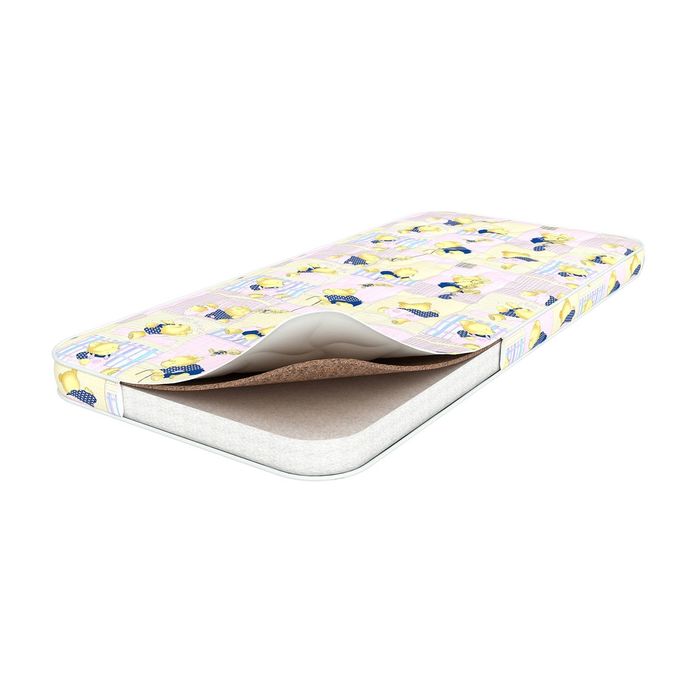 Наполнитель из натурального кокосового волокна обеспечивает твёрдость поверхности, необходимую для здоровья малыша в первые годы жизни. Кокосовая койра хорошо вентилируется, позволяет коже ребёнка дышать. Пропитка латексным составом увеличивает срок службы изделия и блокирует размножение микроорганизмов и постельных клещей внутри матраса.