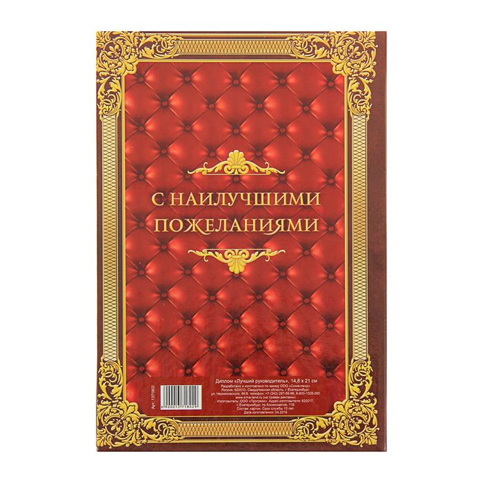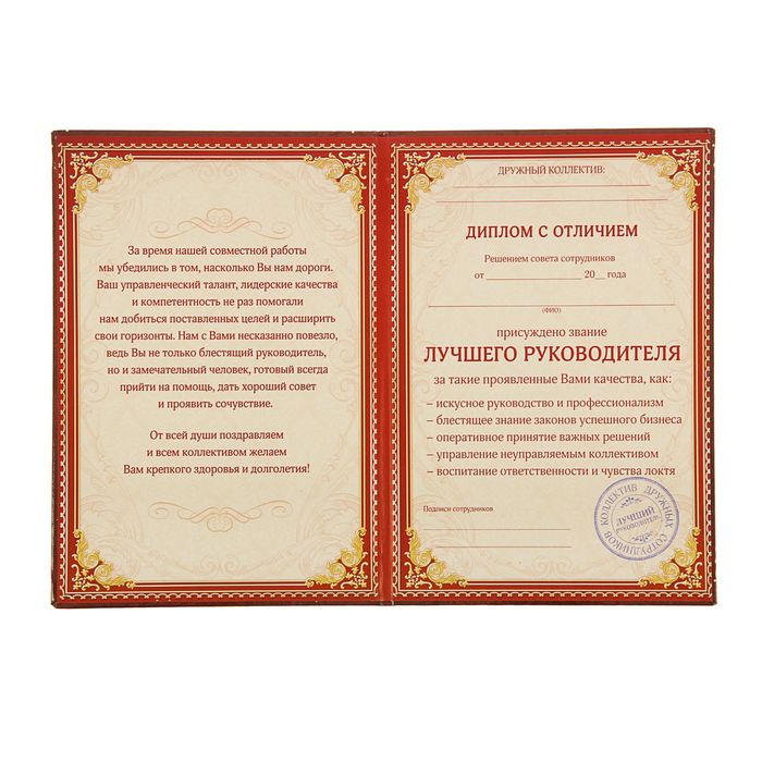 Он займёт достойное место среди официальных документов адресата, ведь будет вручён ему по праву: за самые исключительные заслуги! Изделие изготовлено из ламинированного картона и бумаги.