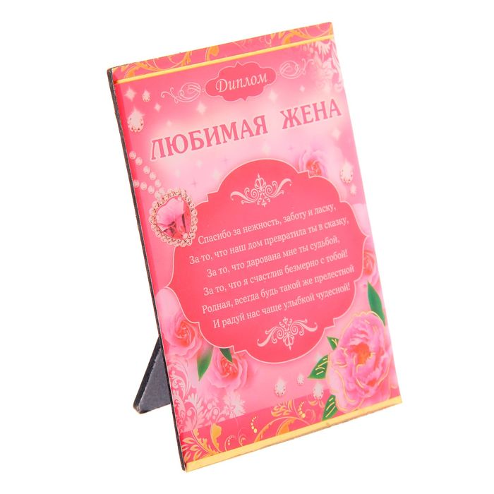 Диплом "Любимая жена" — отличный и запоминающийся подарок. Он изготовлен из бумаги и полимерной смолы, можно не бояться, что он разобьётся как стеклянный. Награда украсит любой интерьер и будет долго радовать обладателя. Сувенир дополнен специальной ножкой, благодаря которой счастливый владелец поставит его на почётное место на полке или столе.