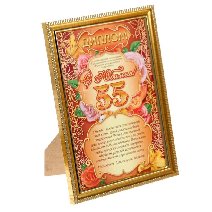 Диплом "С Юбилеем 55" в красочном авторском исполнении — настоящая находка для тех, кто ищет необычный способ поздравить молодую семью. Он подчеркнёт торжественность момента и создаст настроение праздника!Оригинальная золотая рамка, выполненная в классическом стиле, превращает награду в достойное дополнение любого интерьера.