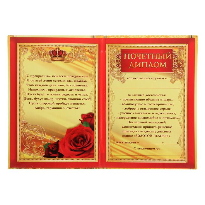 Изделие — отличный вариант для оригинального поздравления. Эффектные красочные изображения, поздравления и тёплые слова в стихотворной форме, поле для имени получателя и перечень причин для вручения делают его незаменимым аксессуаром любого события! Диплом формата А6 изготовлен из плотного картона.