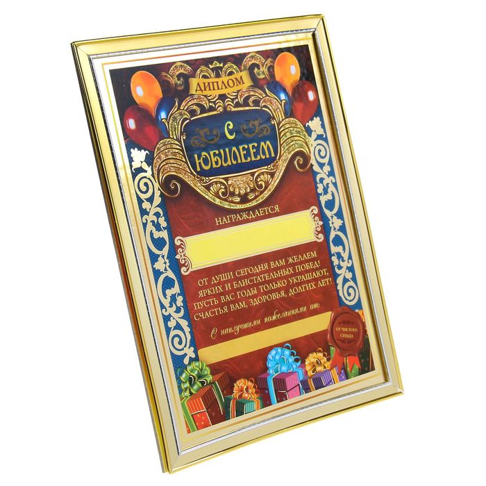 Диплом "С юбилеем" — это интересная альтернатива слегка надоевшим открыткам: необычная форма, оригинальный дизайн и тёплые душевные слова в адрес виновника торжества.